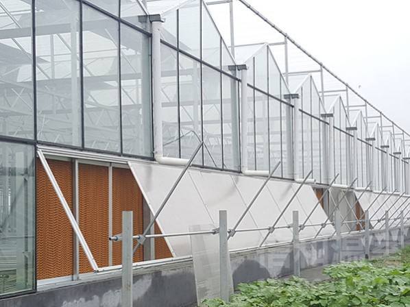 連續(xù)開窗系統(tǒng),由若干排齒輪齒條,在驅(qū)動(dòng)軸的帶動(dòng)下,將溫室窗戶進(jìn)行開啟。連續(xù)開窗適用于各種類型的溫室,可有效提高溫室通風(fēng)面積,達(dá)到增加溫室通風(fēng)降溫的效果。主要設(shè)備配件有減速電機(jī)、傳動(dòng)軸、齒條、齒輪、軸承座等。扭距分配式開窗系統(tǒng)是連續(xù)式開窗的一種,由一臺(tái)減速電機(jī)驅(qū)動(dòng)一系列扭距分配器,扭距分配器作用于連續(xù)開窗的驅(qū)動(dòng)軸,實(shí)現(xiàn)開窗。交錯(cuò)開窗系統(tǒng)又稱為推桿開窗系統(tǒng),適用于Venlo型溫室。開窗時(shí),齒輪齒條在驅(qū)動(dòng)軸帶動(dòng)下運(yùn)動(dòng),推動(dòng)推桿向前運(yùn)動(dòng),在支撐臂的作用下,將窗戶打開。交錯(cuò)式開窗僅適用于頂開窗系統(tǒng)。交錯(cuò)式開窗因齒輪齒條機(jī)構(gòu)不同而分為軌道式和擺臂式兩種形式。二者主要區(qū)別于,前者單根齒條推力大,可適用長(zhǎng)度較大的溫室,后者適用于長(zhǎng)度較小,但結(jié)構(gòu)簡(jiǎn)單,造價(jià)較低。系統(tǒng)組成:齒輪、齒條、推拉桿、減速電機(jī)、驅(qū)動(dòng)軸、支撐臂等附件。