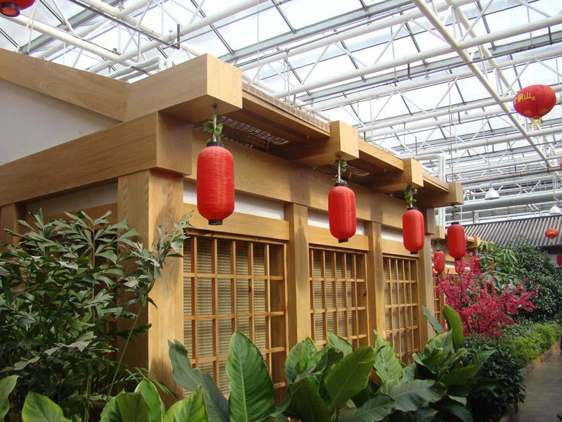 綠色生態餐廳中廳采用大型鋼結構形式,跨度大,高度高、可植入高大樹木,設置亭臺,造景時有更大的發揮空間,使景色更加逼真。中廳周圍設置其他配套連棟溫室,大部分餐飲設置于其中,降低大大的造價和后期維護費用,同時保證了充足的活動空間,美景美食交相輝映,相得益彰。
